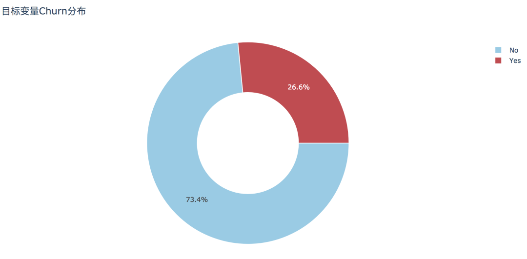 trace0 = go.Pie(labels=df['Churn'].value_counts().index, values=df['Churn'].value_counts().values,hole=.5,rotation=90,marker=dict(colors=['rgb(154,203,228)', 'rgb(191,76,81)'], line=dict(color='white', width=1.3)))data = [trace0] layout = go.Layout(title='目标变量Churn分布')fig = go.Figure(data=data, layout=layout)py.offline.plot(fig, filename='./html/整体流失情况分布.html')