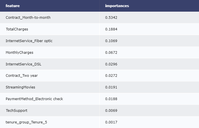 imp = pd.DataFrame(zip(X_train.columns, clf.feature_importances_))imp.columns = ['feature', 'importances']imp = imp.sort_values('importances', ascending=False)imp = imp[imp['importances'] != 0]table = ff.create_table(np.round(imp, 4))py.offline.iplot(table)
