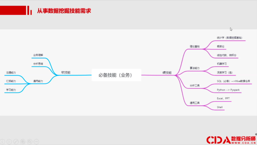 不同于算法工程师对算法的要求会比较高,像偏业务的数据挖掘的岗位,对算法的要求没那么高。你能够做到理解算法的基本原理跟应用场景,能够应用工具去实现它,能够解读算法最后的结果,也就差不多了,对数学的要求也并不太高。