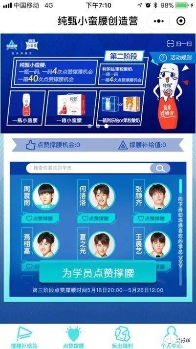 纯甄小蛮腰开启了“撑腰活动”,引导粉丝购买纯甄小蛮腰为学员投票,一瓶纯甄小蛮腰可以投4票,一箱是40票。