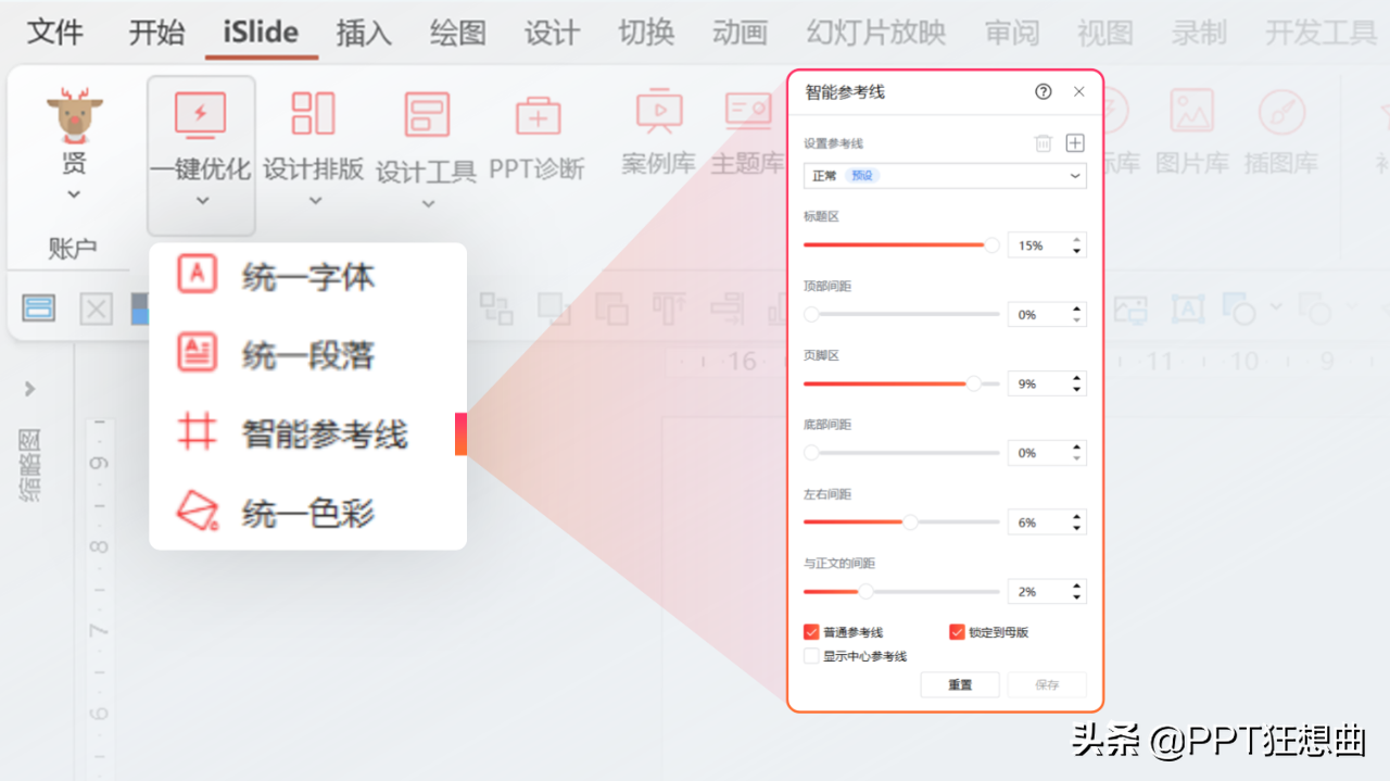 在PPT插件中islide里,可以使用智能参考线这个功能,并且支持自定义调节,非常的方便