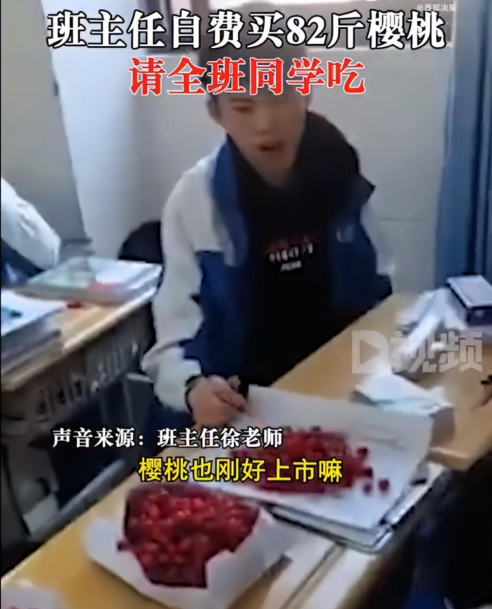 2、班主任买82斤樱桃请全班同学吃 13日,贵州六盘水一位班主任自费买了82斤樱桃,请班里的同学们吃。班主任徐老师表示,想着孩子们学习比较辛苦,很多父母都在外地打工,就代替父母关心一下孩子。(@人民网)