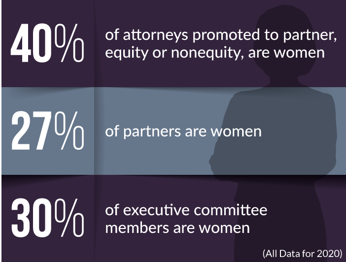 谈到招聘,今年对Law360的调查做出回应的事务所表示,在2020年加入他们的律师中有超过45%的是女性,在加入新律所的合伙人中有超过30%是女性,另外有超过16%被雇用的律师是有色人种女性。