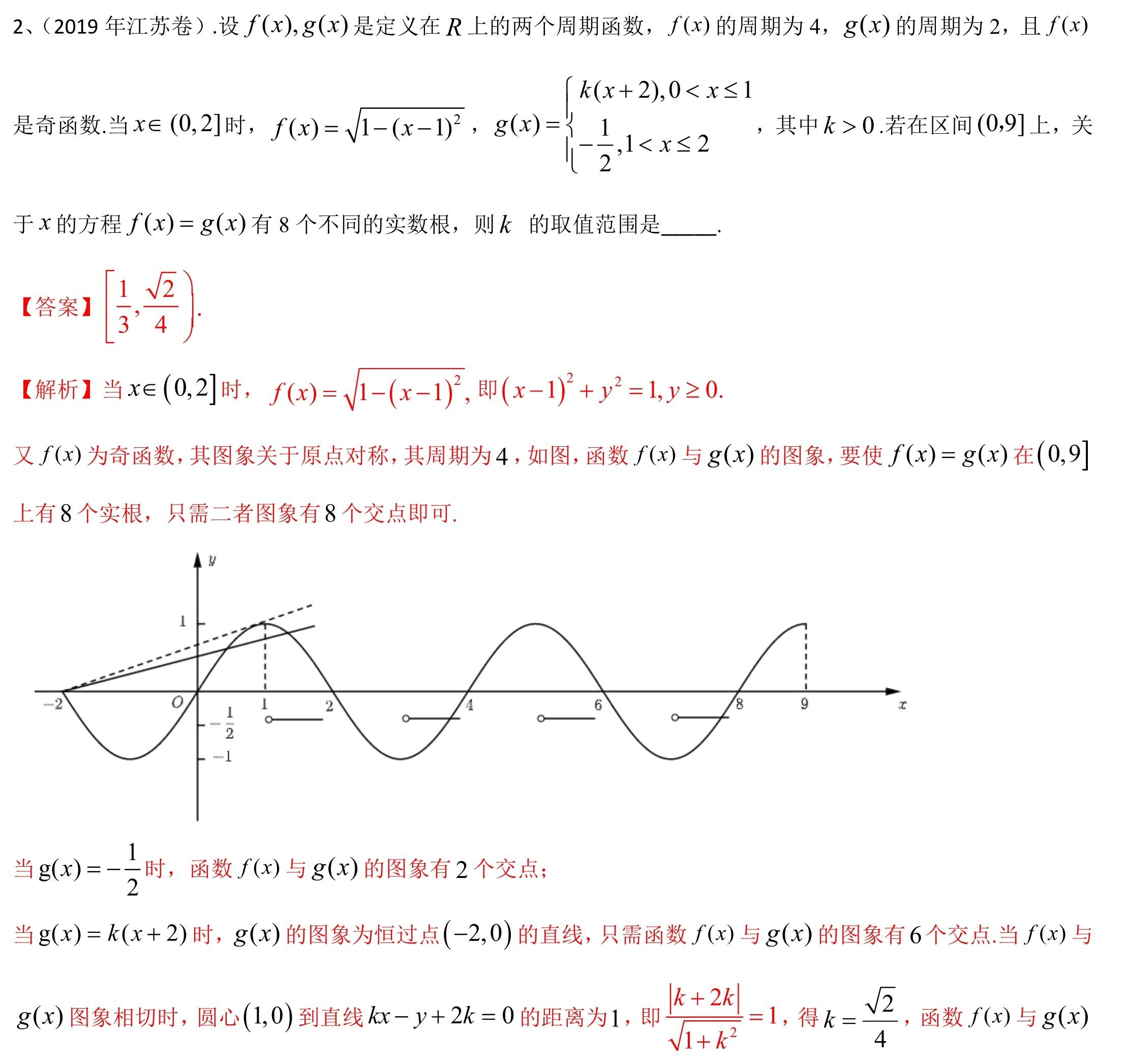 运用函数的图像判断零点的个数是近几年江苏高考的热点也是难点,2018、2019年江苏高考的填空题的压轴题均考查了。运用函数的图像研究函数的零点问题的关键要正确做出函数的图像,观察图像交点的个数。由于答案依赖于图像因此,要正确规范的做出图像,该标的关键的点、线要标出,另外有时为了更好地作图也要多对函数进行调整,变成常见的函数。