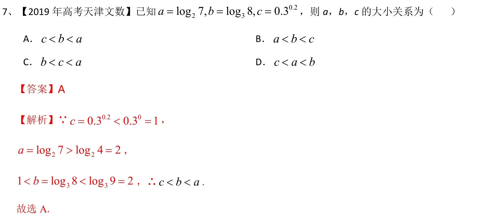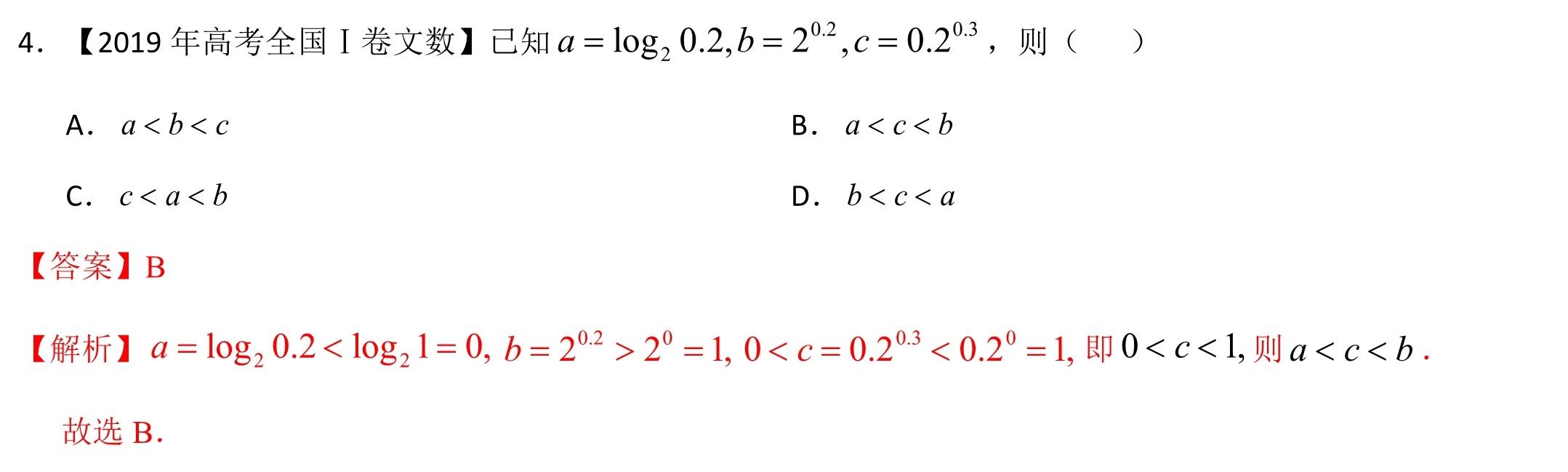 (2)利用特殊值作“中间量”:在指对数中通常可优先选择“-1,0,1”对所比较的数进行划分,然后再进行比较,有时可以简化比较的步骤(在兵法上可称为“分割包围,各个击破”,也有一些题目需要选择特殊的常数对所比较的数的值进行估计,