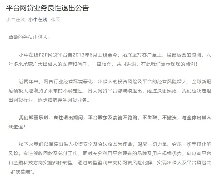 1、小牛在线必须切实负担起公告清退和化解风险的主题责任,加强与出借人的有效沟通,保障出借人合法权益。