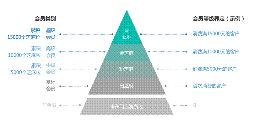 会员等级设计分为五个等级,第一个是从来没有在门店消费过的,是非会员的;基础会员是首次消费的客户,中级会员是我们的粉芝麻,消费满5000元就可以积累到5000个芝麻粒;金芝麻是我们的高级会员,消费满1万元就可以累积到1万个芝麻粒;超级会员是我们的蓝芝麻,消费满15000元的客户,就可以累积到15000个芝麻粒。