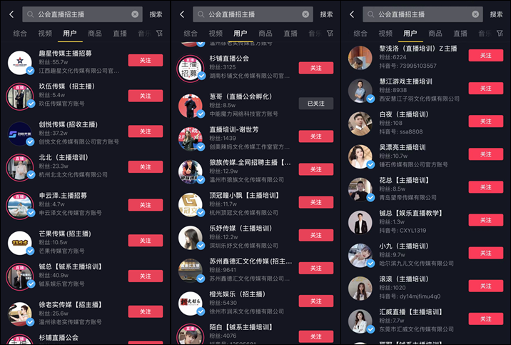 “这是抖音上近2-3个月比较火的一个主播招募模式。”某公会长表示,他近期就自己在抖音上开播,通过聊天的方式,配合连麦互动为自己的公会招募主播。在抖音上搜索“公会主播招募”,可以找到大量类似苏江、崽崽这样账号昵称含有「主播培训」的蓝V账号。