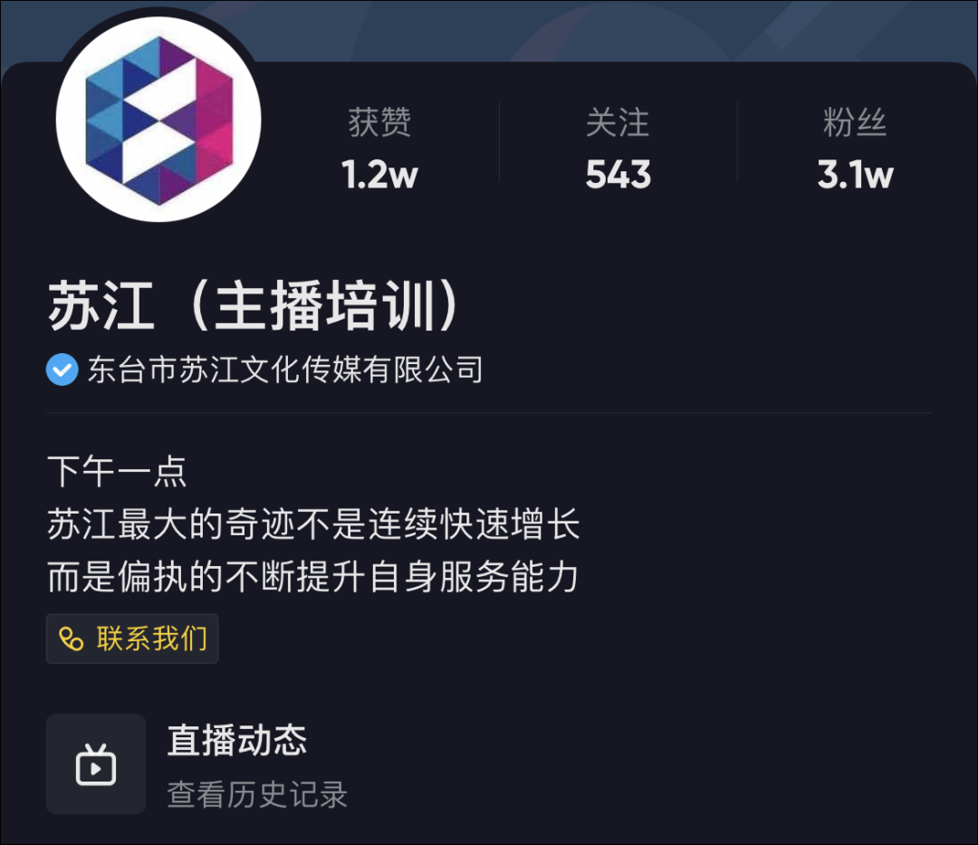 以上面提到的@苏江(主播培训)为例,其背后的公会是苏江文化传媒(以下简称“苏江传媒”)。
