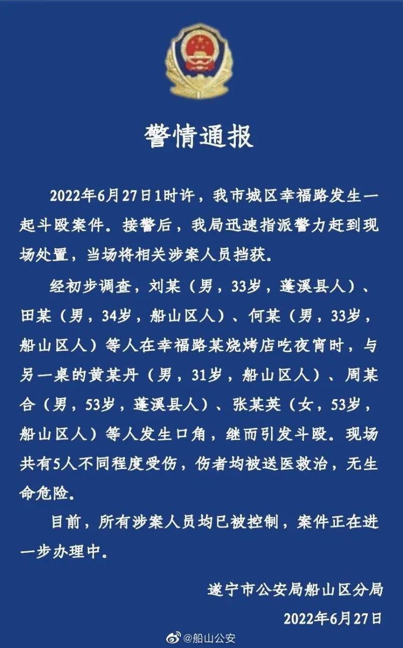 四川遂宁警方通报烧烤店斗殴案件
