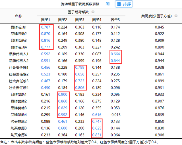 除了“张冠李戴”现象,有时候会出现‘纠缠不清’现象,比如案例中的“品牌赞助4”可归属为因子2,同时也可归属到因子4,这种情况较为正常(称作‘纠缠不清’),需要结合实际情况处理即可,可将该项删除,也可不删除,这时,分析带有一定主观性。