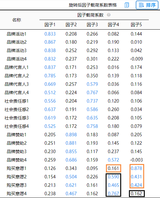 品牌代言人1-4共4项,它们全部对应着因子1,但是品牌代言人3、品牌代言人4同时又属于因子3,属于“纠缠不清”,暂不处理。