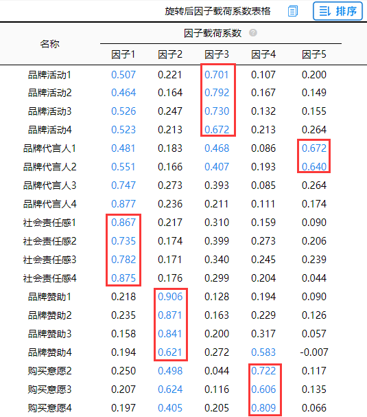 “品牌代言人1-2”可同时出现在因子1和因子5下面,但考虑到因子5当前仅余下2项,因而表示可以接受,以及“社会责任感1-4”是一样的,最终找出五个因子,它们分别与项之间的对应关系良好。因子分析结束。