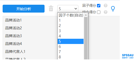 因为案例的预设维度为5所以将分析项拖拽到右侧分析框后,下拉选择因子个数为5并勾选因子得分。