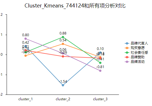 从图中可以发现各个类别之间有明显的区别,聚类的效果较好。其中发现第一个类别品牌活动与品牌代言人都比较大,建议研究时可以更加关注。