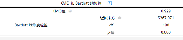 使用因子分析进行信息浓缩研究,首先分析研究数据是否适合进行因子分析,从上表可以看出:KMO值为0.929,大于0.6,满足因子分析的前提要求,意味着数据可用于因子分析研究。以及数据通过Bartlett 球形度检验(p<0.05),说明研究数据适合进行因子分析。接下来查看分析项是否需要调整。