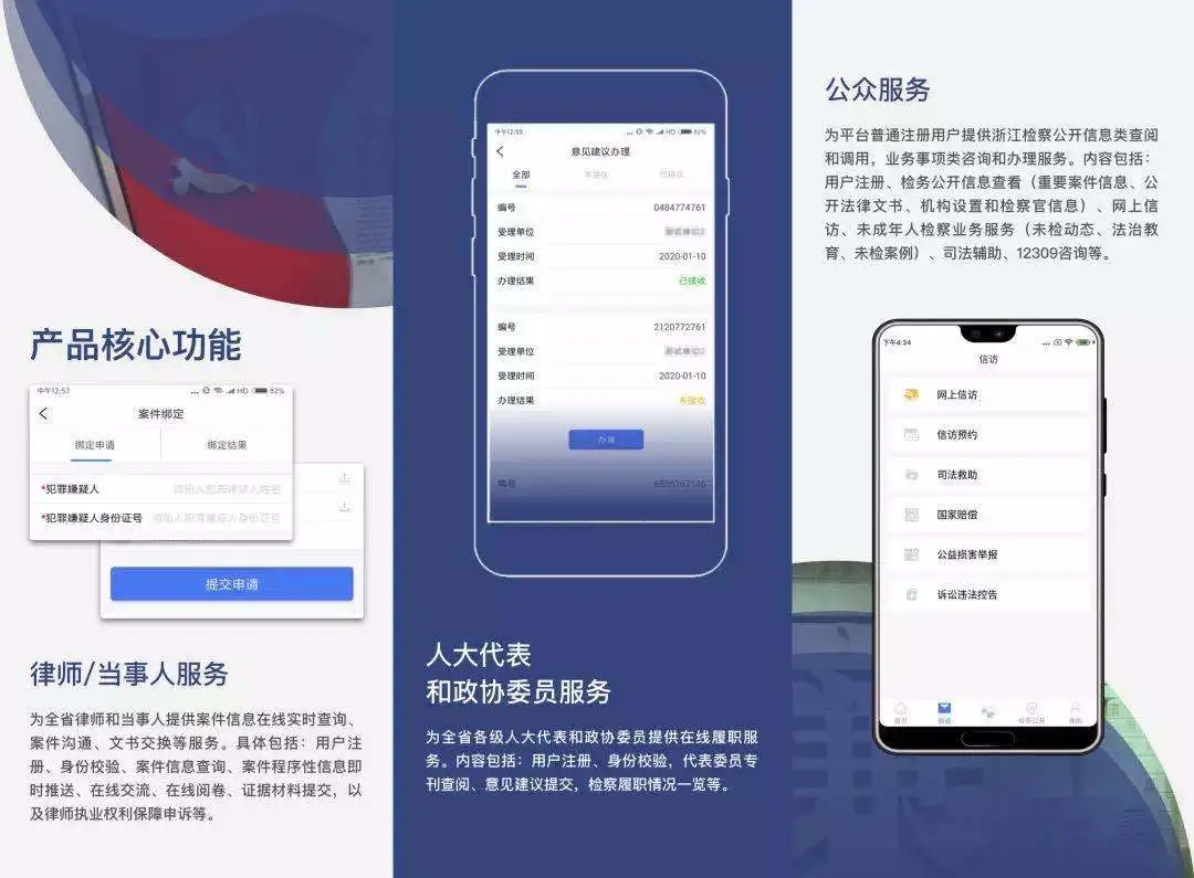 平台为普通注册用户提供浙江检察公开信息类查阅和调用、业务事项类咨询和办理服务。内容包括:用户注册、检务公开信息查看(重要案件信息、公开法律文书、机构设置和检察官信息)、网上信访、未成年人检察业务服务(未检动态、法治教育、未检案例)、司法辅助、12309咨询等。