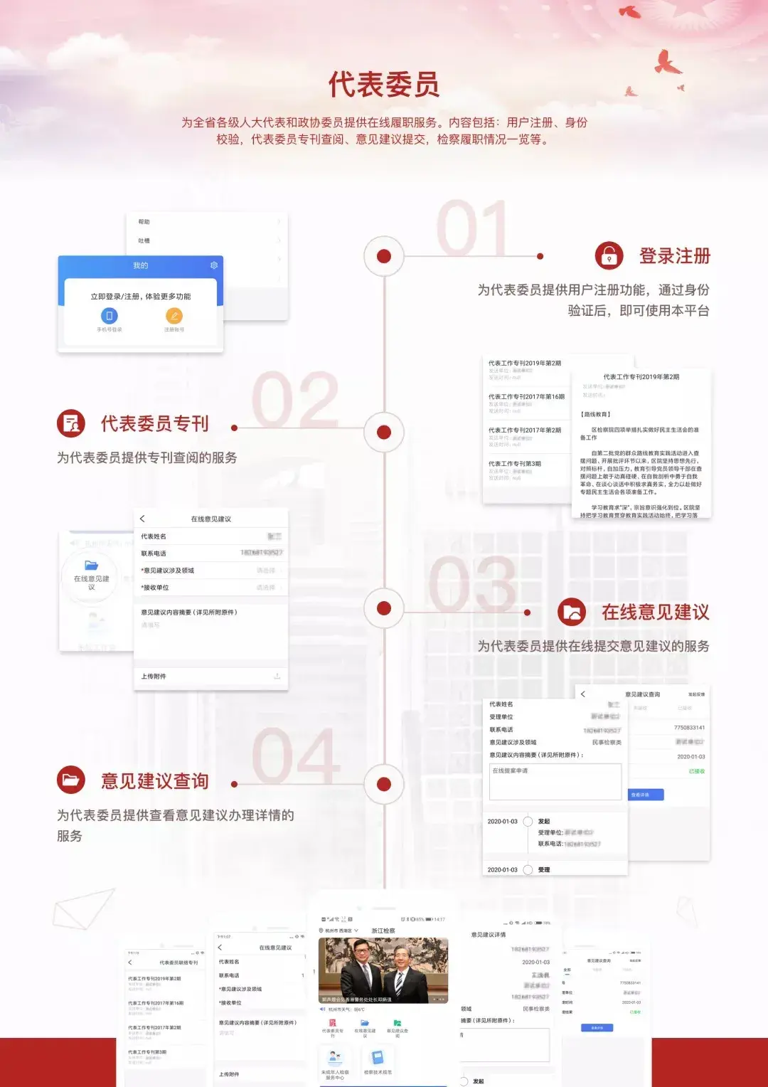 平台为全省各级人大代表和政协委员提供在线履职服务,内容包括:用户注册、身份校验、代表委员专刊查阅、意见建议提交、检察履职情况一览等。