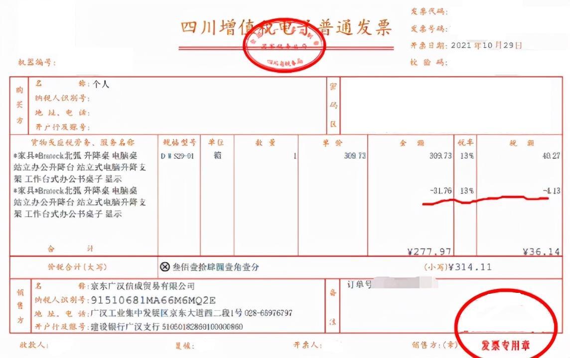 这张发票可能大家都不会陌生,你网上买东西基本都是有折扣的,折扣发票开出就是这样,一行正价的,一行折扣的负数,合计就是你支付的钱。