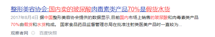 [3]观察者网. 整形美容协会:国内卖的玻尿酸肉毒素类产品70%是假货水货. 2017-08-04