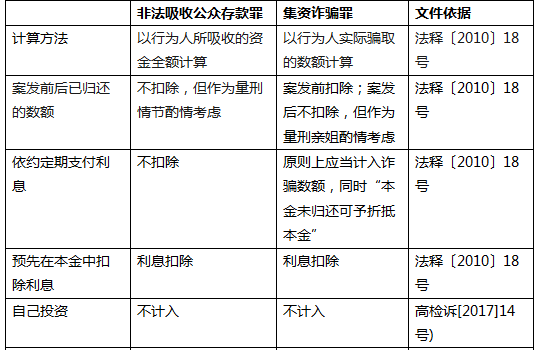 如前所述,非法吸收公众存款罪和集资诈骗罪在是否扣除案发前已归还金额,计算方式不一样。非法吸收公众存款案不扣除,但是集资诈骗案扣除。