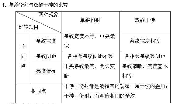 (1)单缝衍射:中央为亮条纹,向两侧有明暗相间的条纹,但间距和亮度不同.白光衍射时,中央仍为白光,最靠近中央的是紫光,最远离中央的是红光.