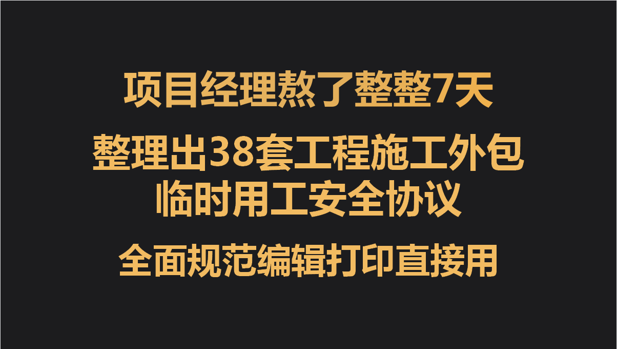 现在建筑工程行业里普遍采取的还是劳务外包的方式,存在很大的安全风险,我们项目经理熬了整整7天,整理出38套施工外包临时用工安全协议书,真牛。