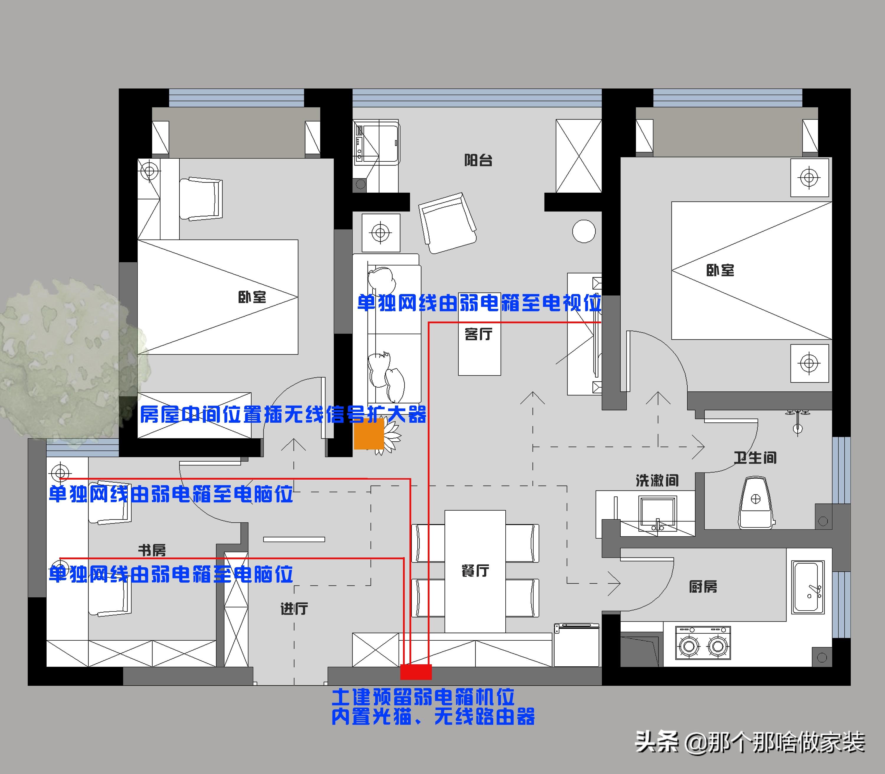 下面我通过两个不同户型,两个不同方案网线的布局教给大家两种简单的方法,可操作性极强。