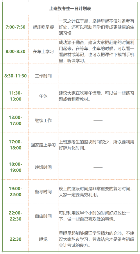 上班族考生、妈妈级考生、在校考生以及脱产考生每天能用来学习的时间是不同的,沐沐现在先以上班族考生为代表,做了一个大概的计划表。