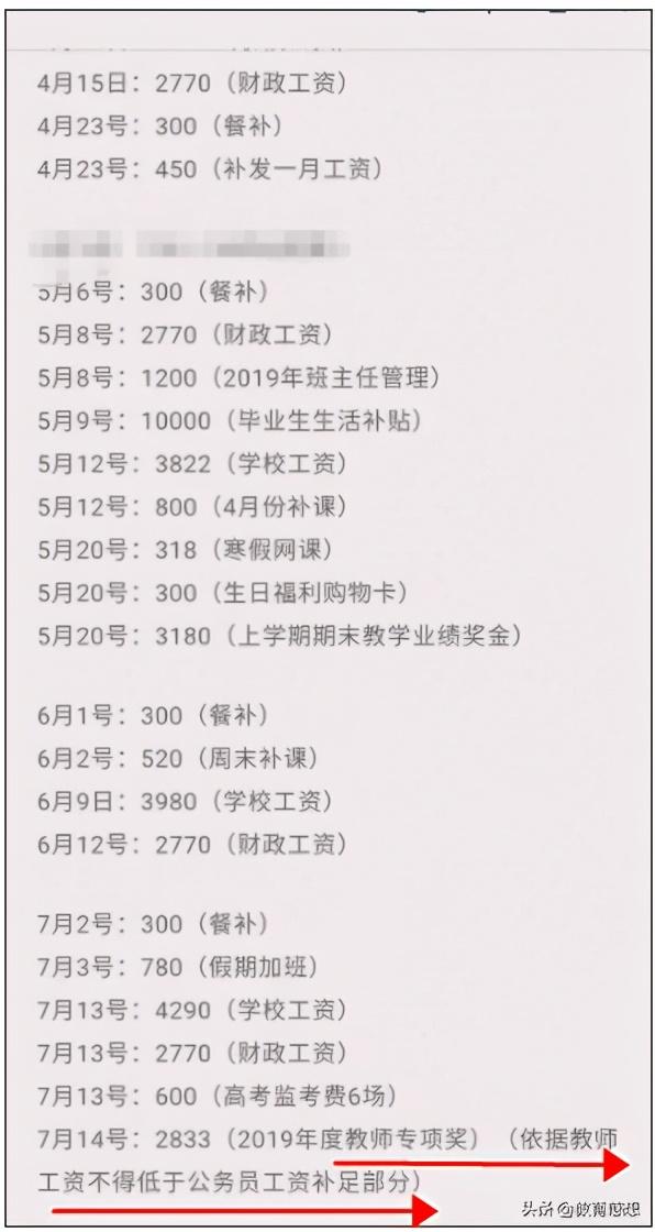 杭州市下面一个县城,本人2019年11月份入编,工作任务:教高一地理,然后担任一个班班主任。从入职到7月10号发的所有钱,这里只算到手的钱,公积金什么的没算,实习期还没过每个月1000多一点,等过了今年11月,转正之后公积金会有2000多。另外有一笔10000元,强调一下,是(应届)毕业生生活补贴,杭州市财政出的,三年内一共可以领4万。(下图)