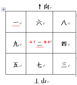 飞星盘中,以大写数字为运星,运盘;大写数字左上方小写数为山星,山盘;大写数字右上方小写数为向星,向盘。排盘时,先排运盘,然后山盘,再向盘。