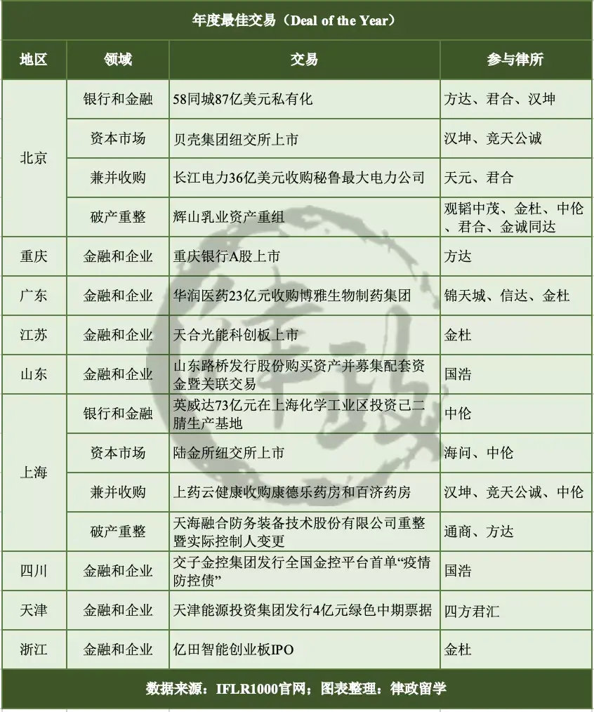 近日,《国际金融法律评论》(IFLR1000)公布了第二届IFLR1000中国奖(IFLR1000 China Awards 2021)获奖名单。该奖项旨在表彰2020年中国最具创新力的交易,以及在各省市或全国范围内表现杰出的律师事务所和律师。奖项入围名单是IFLR1000六个多月的调研成果,期内分析了数百份申报材料、调查了数千名客户、采访了数百名律师。我们一起来看看2020年度中国哪些律所和律师表现最亮眼吧!