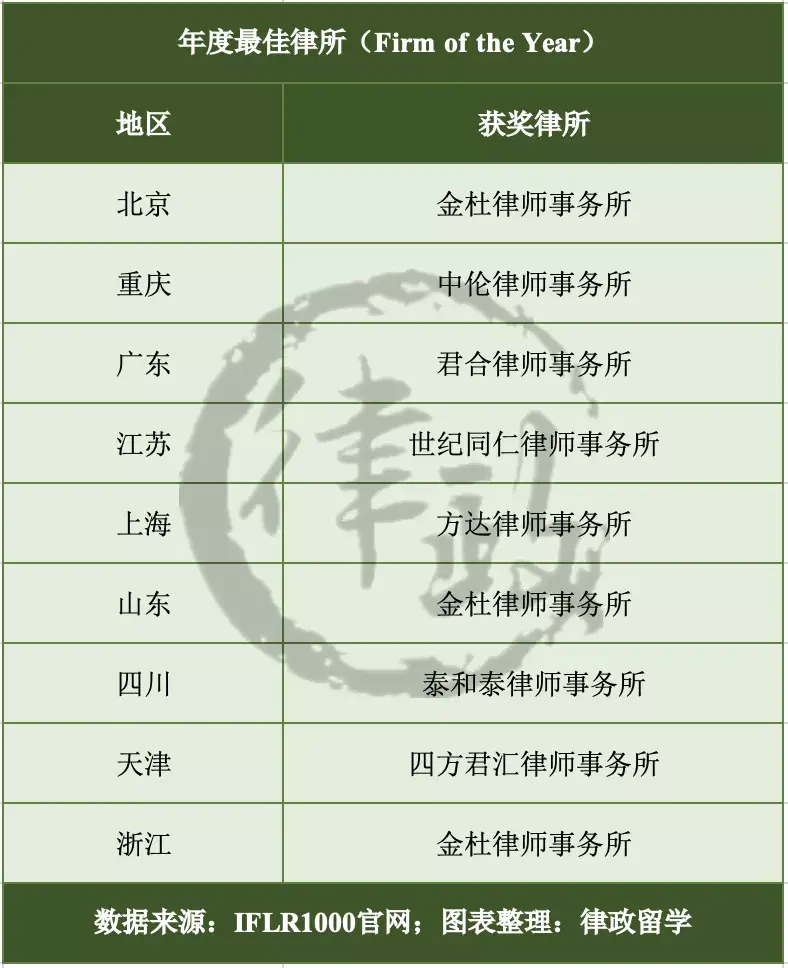 在“年度最佳律所”榜单中,金杜律师事务所上榜三次,分别荣获北京、山东和浙江三个地区的最佳律所,金杜也是上一年度榜单《首届IFLR1000中国奖获奖名单公布!年度最佳律所花落谁家?》中,北京地区最佳律师事务所的获得者。此外,另外一个蝉联地区最佳律所榜单的是四川地区的泰和泰律师事务所。