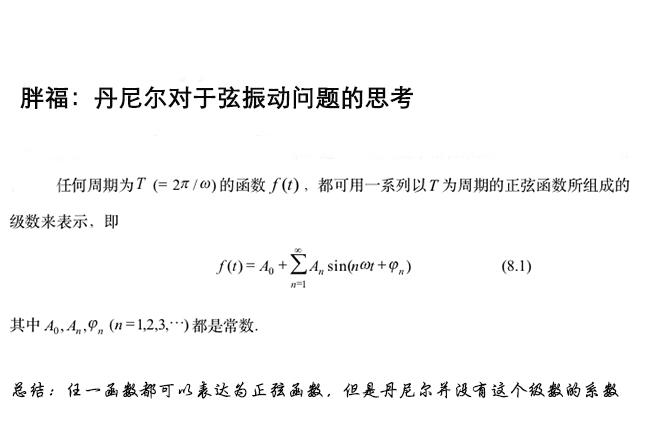 丹尼尔的这个观点是非常重要的,因为他首次提出了将问题的解表示为三角级数的形式,这为将一个函数展为傅里叶级数的纯数学问题奠定了物理基础,促进了分析学的发展。