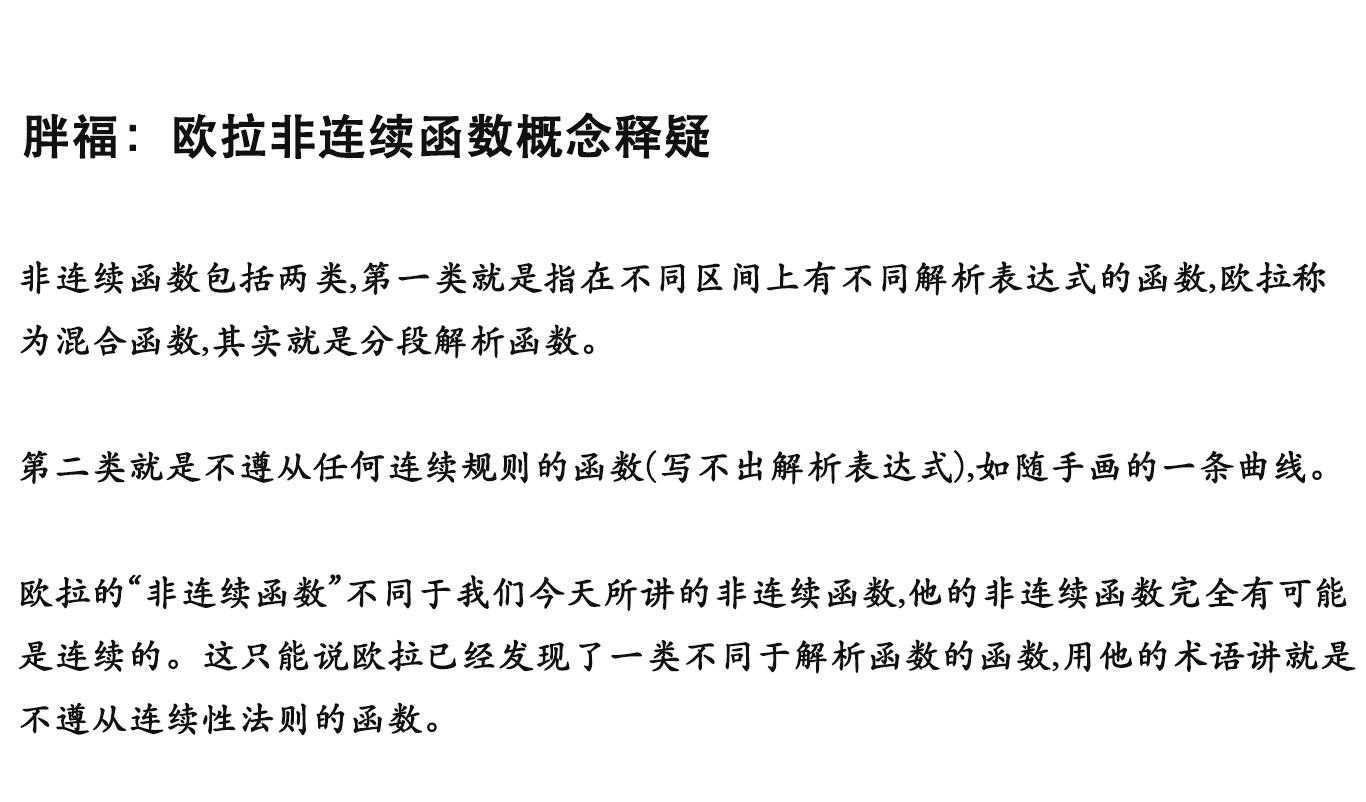 欧拉称此种函数为不连续函数,用通俗的话讲就是,虽然是连续函数,但在相接的地方却是不可以微分的。