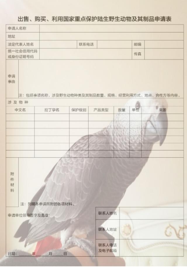 办理购买手续的流程就很简单了,只需要三个材料。第一,出售、购买、利用国家重点保护陆生野生动物及其制品申请表(市林业局可以领),第二,还是动物购买合同(和饲养场签订的)办理驯养证的那个合同,你可以理解成有意图从某鸟场引进,这次的合同是确定从那里引进,第三,引进的鹦鹉脚环号说明,上面要写清什么品种,数量,和每只的脚环号。把这些手续直接交到市林业部门,然后就等着就行了,周期和办理驯养证的时间差不多。