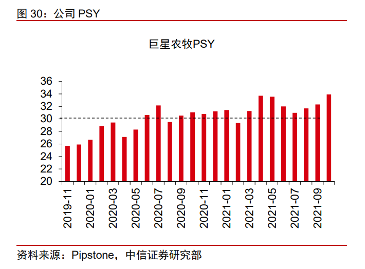 我们认为巨星农牧领先行业的头均利润来自两方面:1)种猪销售带动。2020 年公司 仔猪销售占比近 20%,2021 年公司种猪销售占比近 10%,而从毛利占比来看,2020-2021 年公司种猪毛利占比近 50%,构成养殖主要利润来源。2)种猪优势叠加管理能力,育肥 和仔猪成本领先。我们测算公司 2021 年育肥完全成本接近 17 元/公斤,居上市公司前列。 分拆细项来看,巨星头均饲料成本、头均费用等均领先同行,我们认为背后折射出的是其 较高的生产效率等。