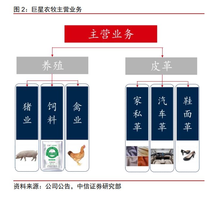 巨星农牧有限公司的产业历程起源可以追溯到 1995 年成立的五星饲料公司,2007 年 正式进军生猪养殖行业,通过与 PIC、PIPESTONE 等深度合作,公司引进了全球一流的 育种和养殖管理技术。2020 年公司通过振静股份实现资产重组(2020 年 6 月振静股份分 别以发行股票的方式支付 17.03 亿元、现金方式支付 1.18 亿元,共计 18.2 亿元收购了巨 星有限 100%的股份)方式上市,并不断扩产能,目前已发展成为西南地区领先的生猪养 殖企业。公司业务范围涵盖生猪养殖、肉鸡养殖、饲料业务以及皮革业务(前振静股份主 营业务),拥有 41 家子公司。