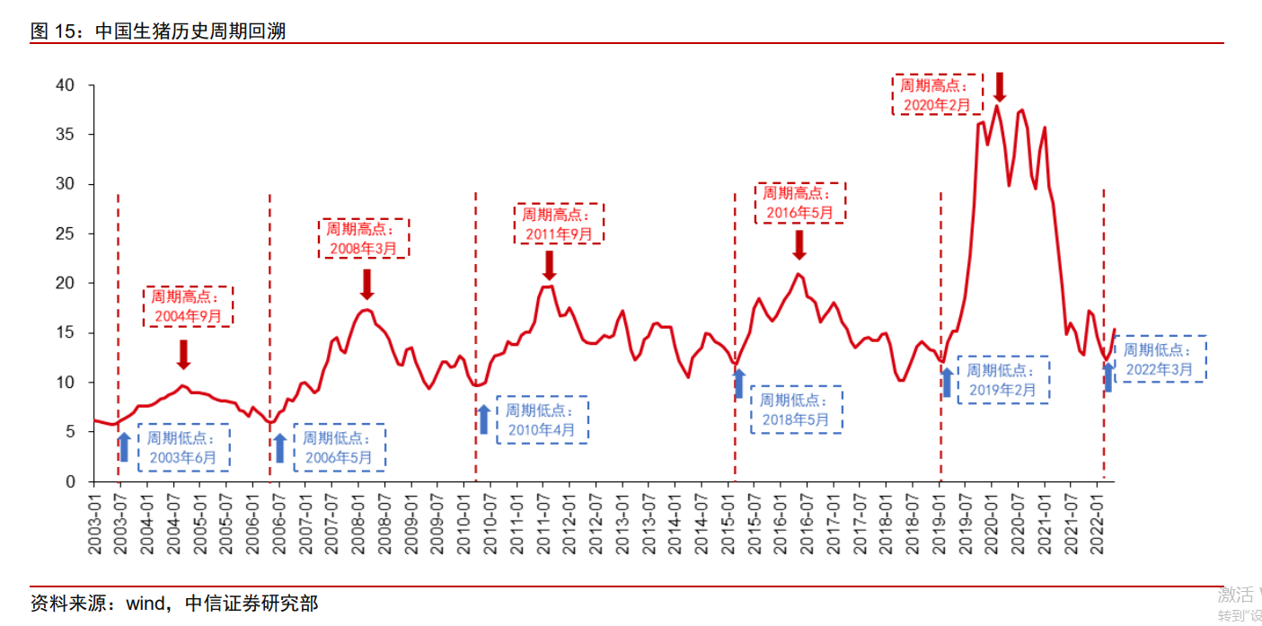 复盘历史周期,我们发现有如下特征:1)下行周期往往长于上行周期时间,且在下行 周期中,猪价会二次或者三次磨底。2)受原料、人工成本上行影响,猪价中枢、底部逐渐 上行。3)疫病、环保等外部力量则会加剧/加速猪周期的波动,譬如 2006 年蓝耳病、2015年环保、2019 年非瘟。4)每一轮猪周期都会加速规模养殖的提升。