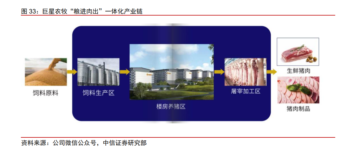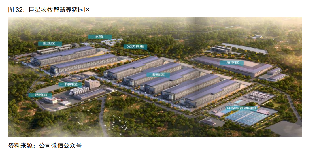 此外,公司逐渐加大向“智慧养猪园区”+“粮进肉出一体化”模式转型。公司未来将 建立了从饲料原料、养殖、屠宰加工到猪肉生鲜的全产业链生产模式,全程监控保证产品 质量。通过一体化经营基本实现了种猪、仔猪、商品猪繁育以及饲料的研发、生产,自产 饲料降低成本,提升效率。