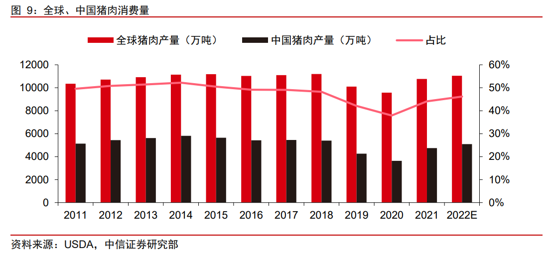 我国生猪养殖量、需求量处于世界前列。猪肉是我国第一大肉类消费品,生猪生产是 我国农业的重要组成部分,关系到国计民生和社会稳定,对国民经济和社会发展都具有重 要意义,一直受到国家重点扶持。长期以来,我国的生猪出栏量和猪肉产量均稳居世界第 一位,生猪养殖量(年出栏 6-7 亿头生猪)和猪肉消费量(约 5000-5500 万吨)均占世界 总量的一半左右。