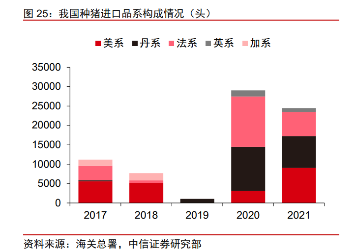 同一品种不同品系之间的种猪性状也存在差异,当前全球种猪品系通常按照地区分为 美系、加系、法系等,此外还包括配套系等。各品系之间有差异,如美加系种猪料肉比、 生长速度、瘦肉率表现优异,但生产性能较一般,丹系猪则相反,配套系在本土适应性上相对较强,其中 PIC 和托佩克配套系综合性能更好。从进口种猪占比来看,美系、丹系、 法系为近年来我国主要种猪引种品系(配套系多在国内有扩繁场,故不在统计范畴内)。