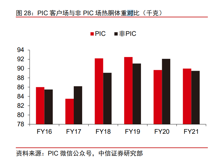 PIC 种猪具备领先优势。PIC 是世界知名的种猪公司,全球种猪市场市占率达 16%, 遥遥领先竞争对手。而根据 PIC 年报数据来看,PIC 客户场在母猪繁殖性能指标和胴体数 据上全面领先非 PIC 客户。母猪繁殖性能指标上,更是在各个阶段就全面领先,如母猪分 娩率、断奶后 7 天发情率、死亡率、LSY 等。