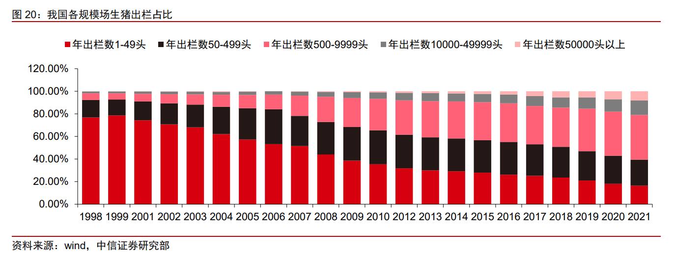 规模化进程加速,行业集中度有望进一步提升。伴随着行业养殖技术的提升、环保政 策的加严以及动物养殖疫病的如影随形,生猪行业在周期变化和外部力量下,规模化进程 迅速提升。2009 年至 2020 年,我国规模以上养殖场出栏量占比由 31.7%提升至 57.1%, CR10 产能占比已达 20%。尽管短期来看,在 2021-2022 年下行周期中,规模场成本似乎 不再有优势,规模化进程稍有停滞,但我们认为长期来看,行业集中度仍会持续提升:1)短期成本优势的缺失更多是由前期资本开支带来折摊偏高所致,长期来看对标美国,规模 化养殖由于具备成本(一体化运营带来上游原材料采购成本优势+规模经济带来成本下降) 和效率优势(科学饲养等带来效率优势),大企业与小养殖户的养殖成本差异将长期保持。 2)规模养殖场尤其是头部上市集团企业拥有更强的抗风险能力和扩张能力。3)与美国相 比,我国的生猪养殖规模化程度仍有较大提升空间(美国在 2002 年规模以上养殖场出栏 量占比就已达到约 98%)。