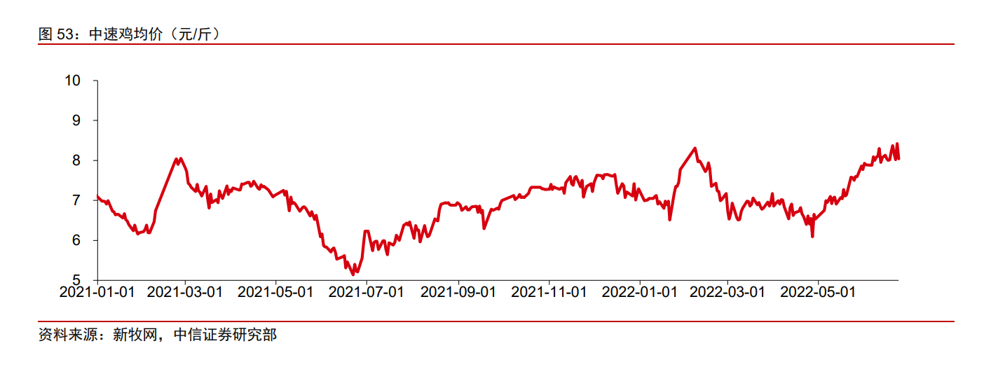 黄羽鸡价格上,由于前期行业产能不断去化,黄羽鸡行业 2022 年景气可期。2022 年 1-5 月黄羽鸡均价 7.05 元/斤,同比上升 0.17%,5 月均价 7.22 元/公斤,同比上升 6%, 6.20-6.24 日均价 8.18 元/斤,环比上升 1.24%,同比上升 48.73%。展望未来,随着前期 产能去化兑现到出栏上以及消费边际回暖,我们认为黄鸡 2022Q3 景气仍可观,2023 年整 体均价或下行,2024 年或重新回暖,整体预计 2022-2024 年黄鸡均价将同比变动+20%/- 16%/+14%。