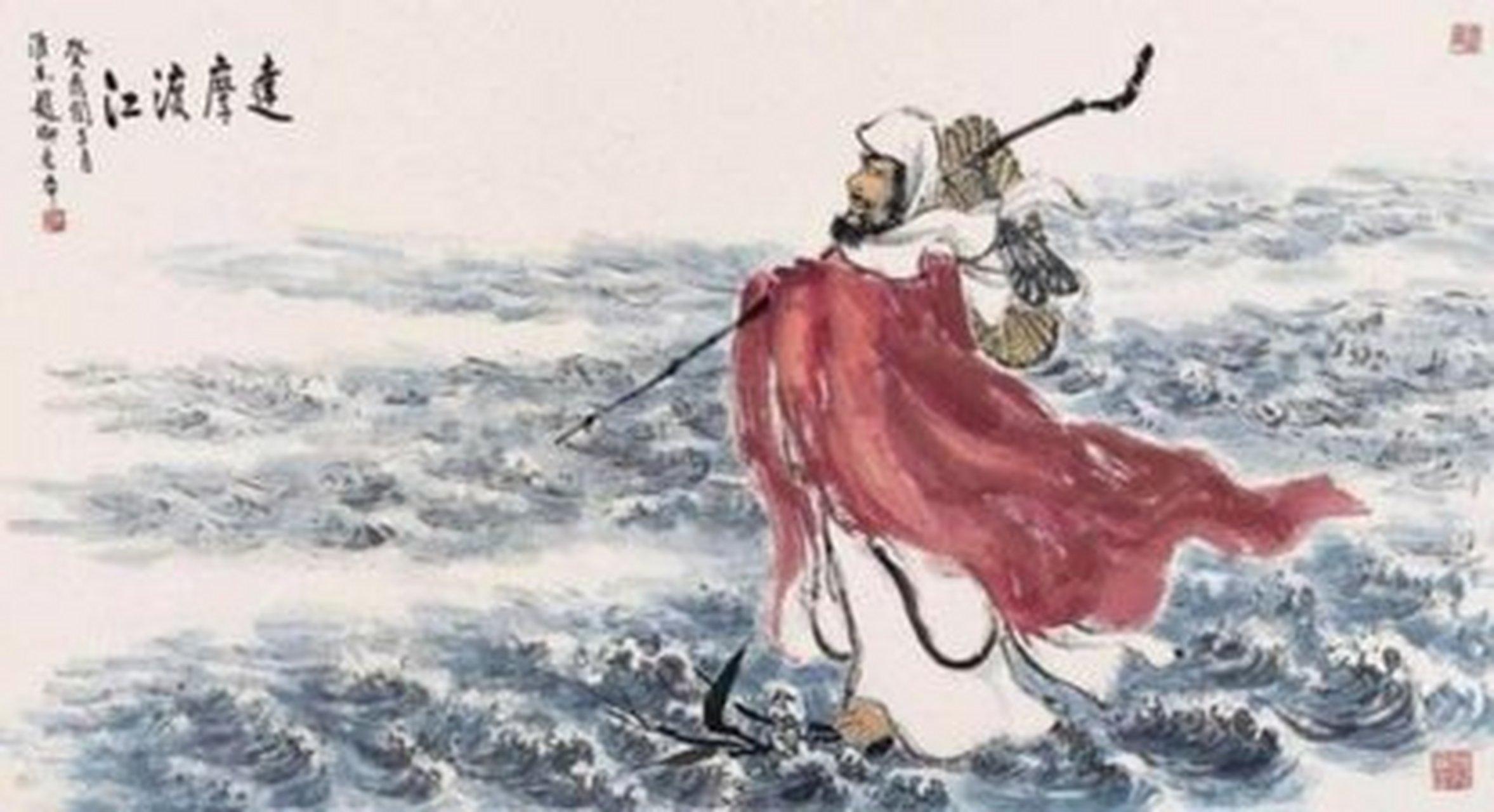 达摩到至长江岸边,滔滔江水,无船渡河。见一老妇在岸边手捆芦苇,没了办法。