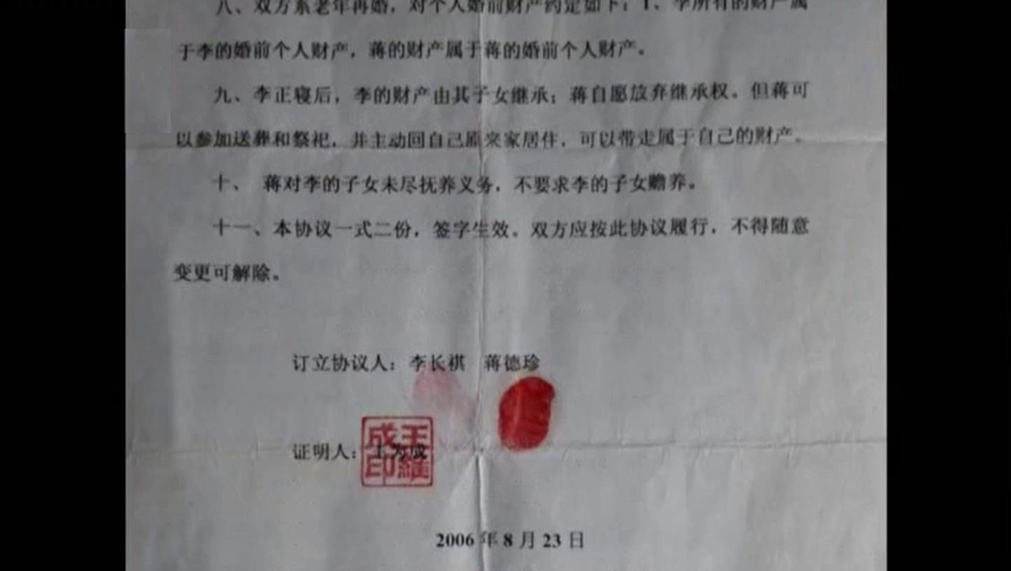婚前协议书是李长祺和蒋德珍在登记结婚之前签订的,其中第九条赫然写着“李长祺的遗产全部由其子女继承,蒋德珍自愿放弃继承权。”协议的最后,是李长祺、蒋德珍的名字,还有双方摁下的红指印。