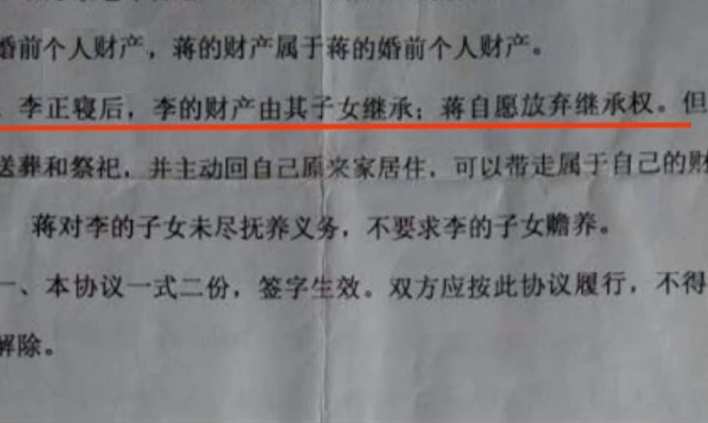 在整理父亲生前遗物时,李小萍发现了两张有些陈旧的打印纸,这张纸不是别的东西,居然是李长祺和蒋德珍签订的婚前协议!
