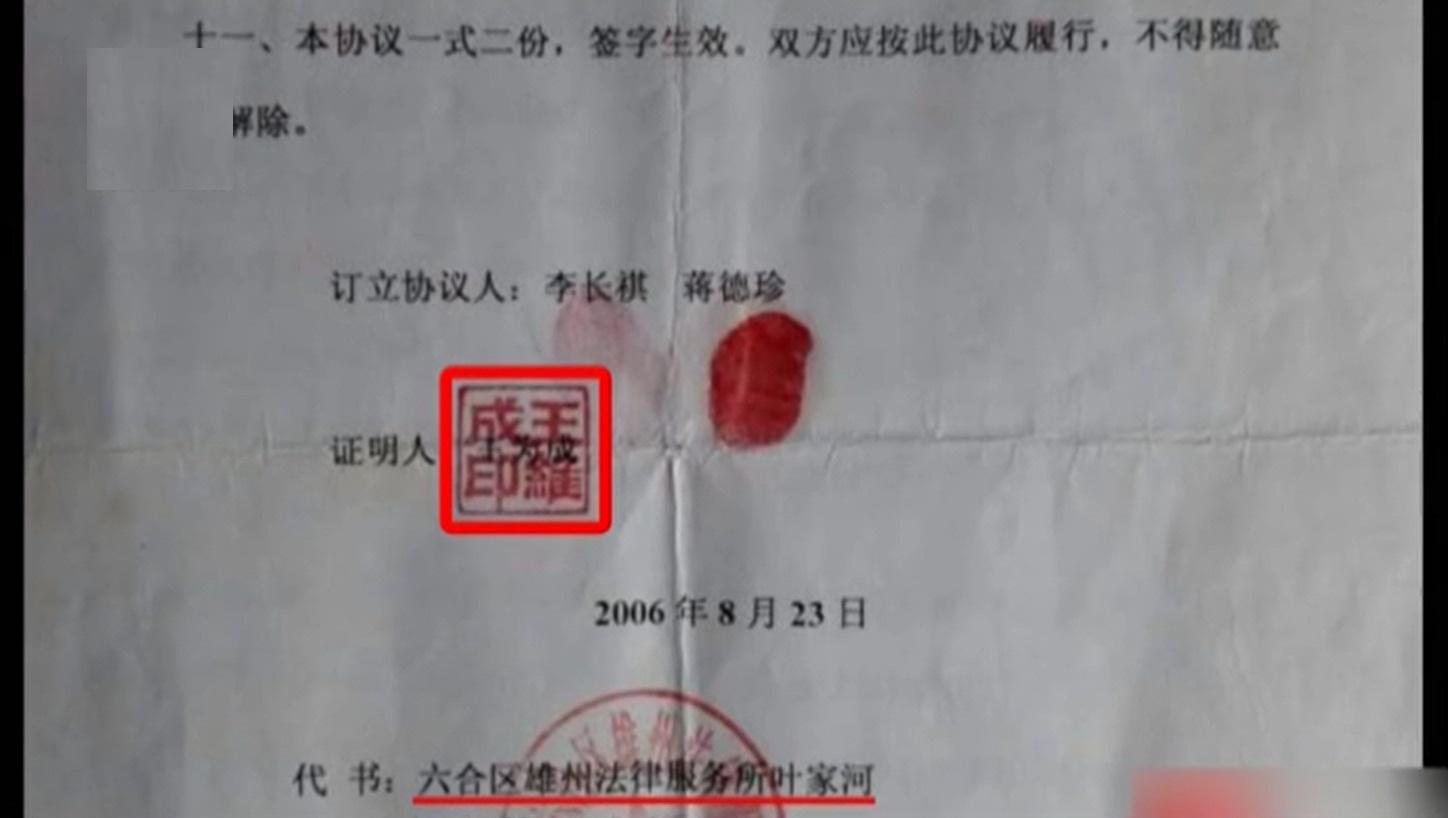 就当大家以为一切水落石出时,叶家河又表示,当时自己代起草的那份协议是手写的,而李小萍拿出来的那份协议是打印件,落款中李长祺和蒋德珍的名字都是打印好的,只有两个红手印,至于这份打印协议是怎么来的,叶家河就不清楚了。