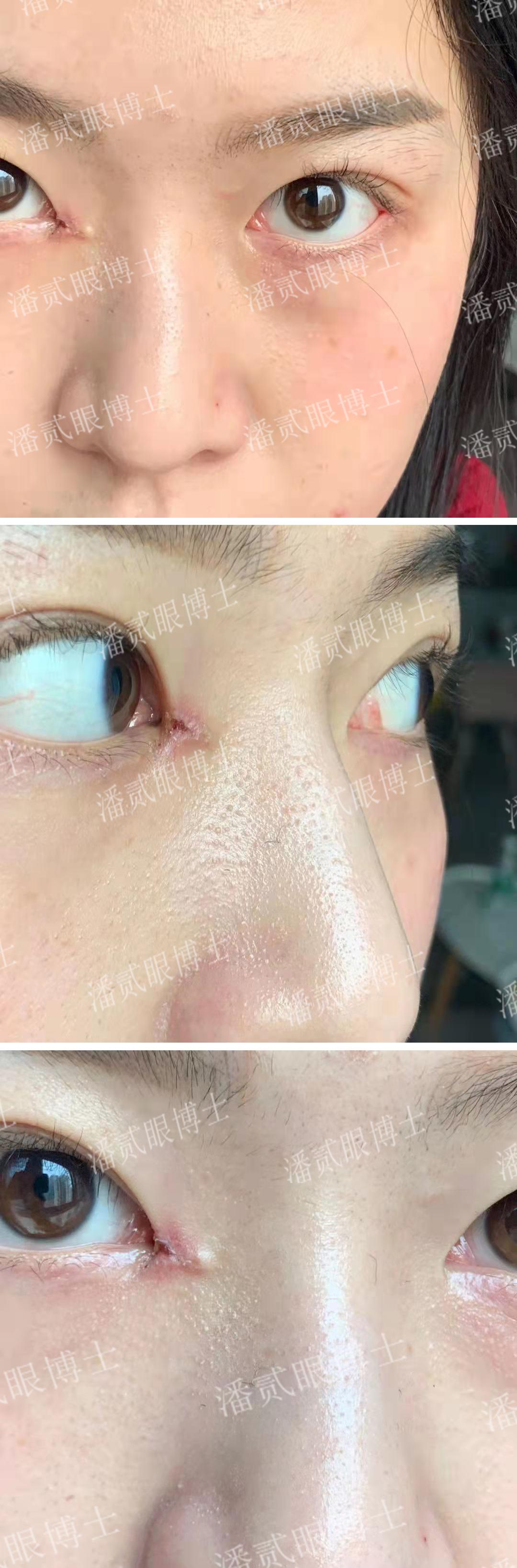 修复前外观虽然不算差,但姑娘想整体更自然,右侧内眼角大点点显平行外观,外眼角睑缘外翻明显漏红不自然。